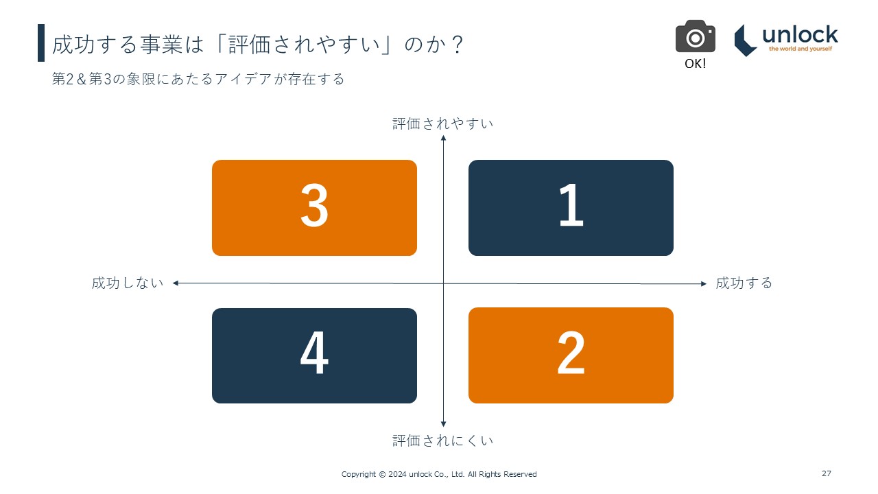 画面では横軸に成功する・しない、縦軸に評価されやすい・されにくい、とあります。