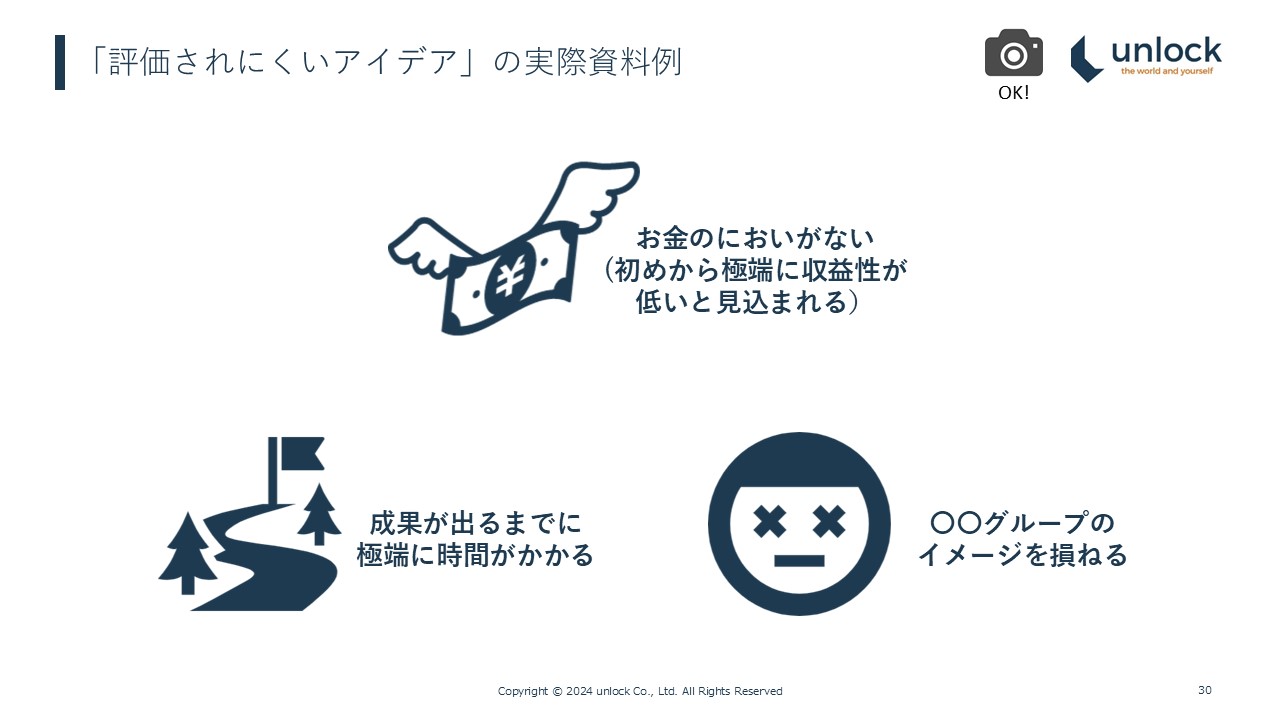 社員さんから上がってきたアイデアには、評価されにくいアイデアも実際にありました。この画面にあるように、お金の匂いがしない、成果が出るまでに極端に時間がかかる、当社のイメージを損ねる、等です。