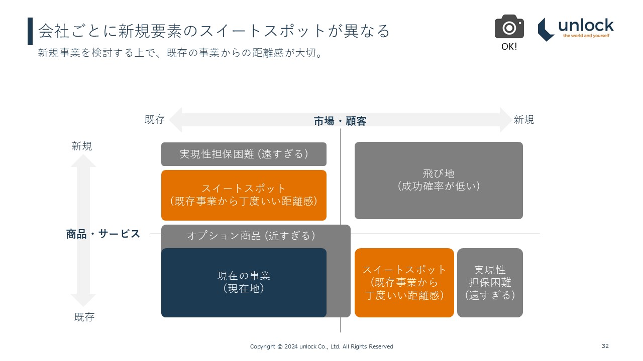 ということは、消去法で考えると、ちょうど良い“距離感”、つまり私がスイートスポットと呼ぶ“距離感”が存在します。この、挑戦する意味がある、または新規事業と呼べる“距離感”は会社ごとにかなり違います。