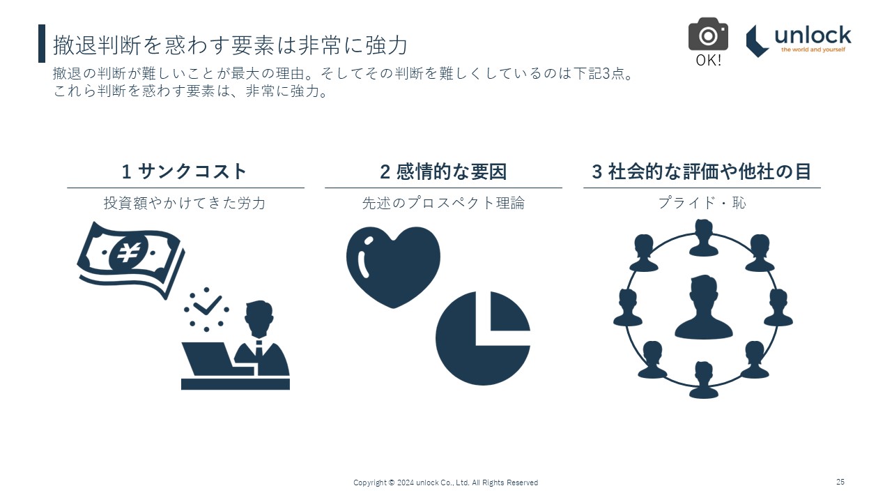 一方で、撤退基準が無く、撤退時期が遅くなれば大きな痛手を受ける撤退がある、というのも事実です。