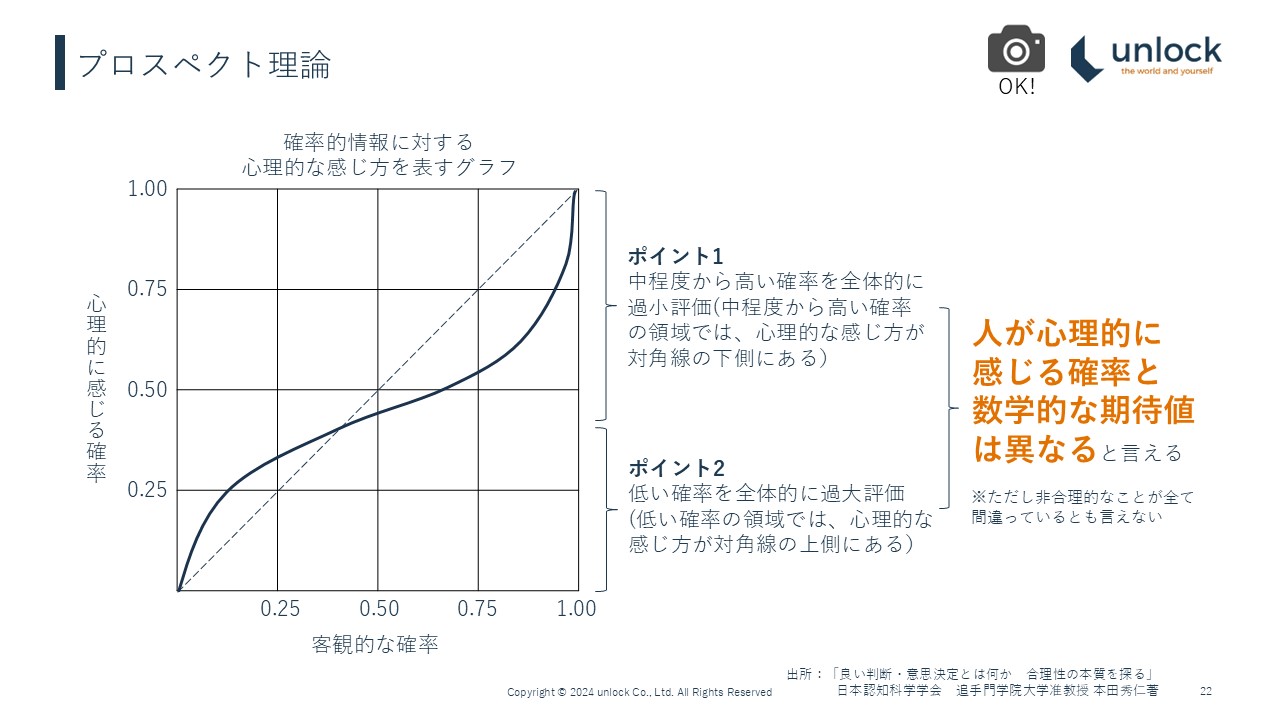 このグラフは横軸に客観的な確率、サイコロとか振るようなパターンですね。これで出る数学的な確率が横軸で、縦軸は心理的に感じる確率です。点線が客観的な確率、実線が心理的に感じる確率です。