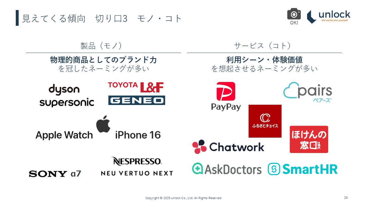 それから右側のサービス(コト)は利用シーン、体験価値を想起させるネーミングが多いです。先ほどご紹介していないものでは、マッチングアプリのpairs、AskDoctors、ふるさとチョイス、こういった名前はコトで言うと非常に多い印象です。