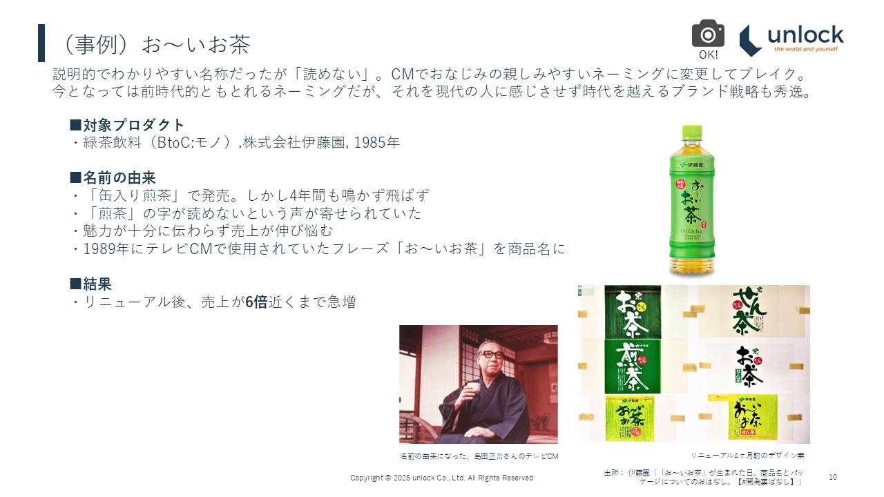 続いて、伊藤園の「お〜いお茶」です。これも皆さんご存知のプロダクトですが、知られざるストーリーがありまして、最初は「缶入り煎茶」という名前で発売していたそうです。
