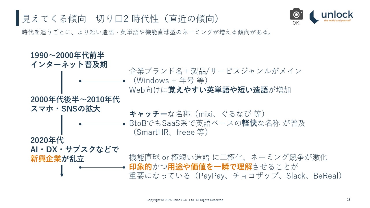 続いて、時代性です。時代にどういった傾向があるのか、特に直近の傾向はどうなのか。AI、DX、サブスクなどで新興企業が乱立しているのが2020年代かと思いますが、より短い造語でどんどんネーミングが短くなっています。短い造語や英単語、機能直球型のネーミングが増えている傾向です。先ほどのPayPay、造語ではSlackとかですね。今、若い人の間で爆発的にヒットしているBeRealとか、こういう短い単語や造語が非常に増えています。長い名前がとにかく減ってきている印象です。
