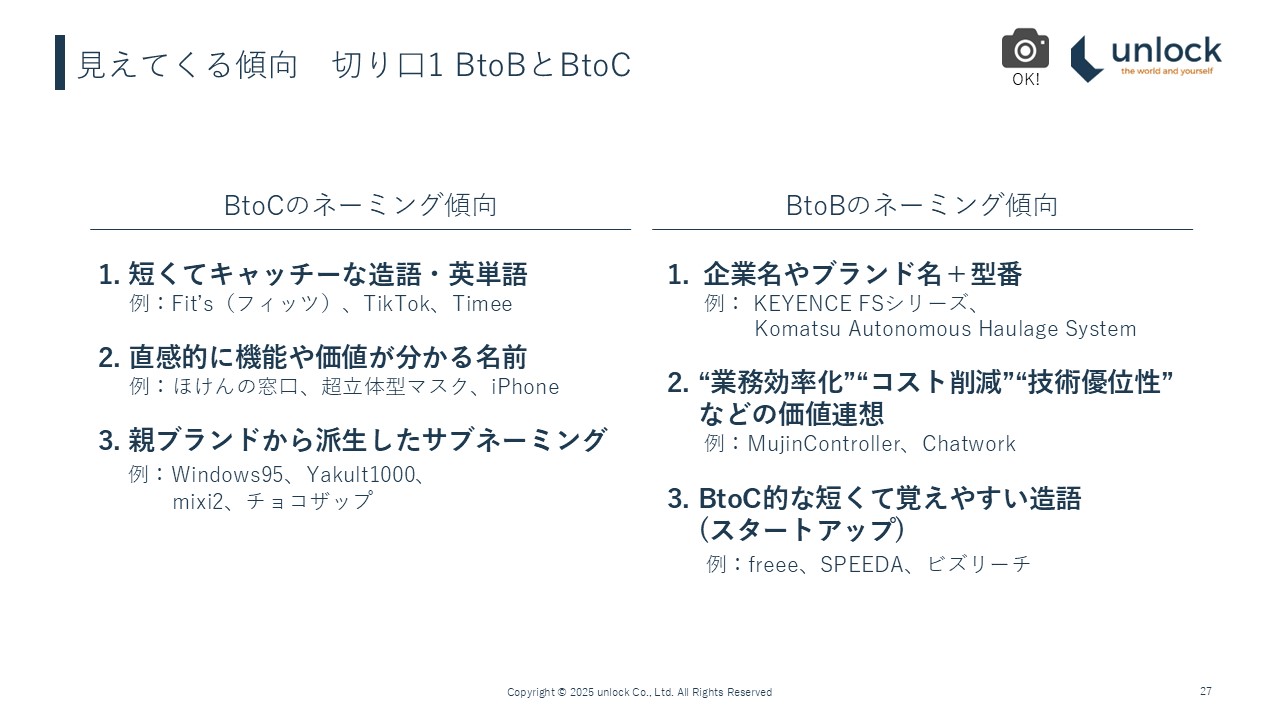 BtoBにおいても、短くて覚えやすい造語が増えている印象です。スタートアップに多いのですが、freee、SmartHR、ビズリーチとか、こういったものがBtoB向けのネーミングでも増えてきているようです。