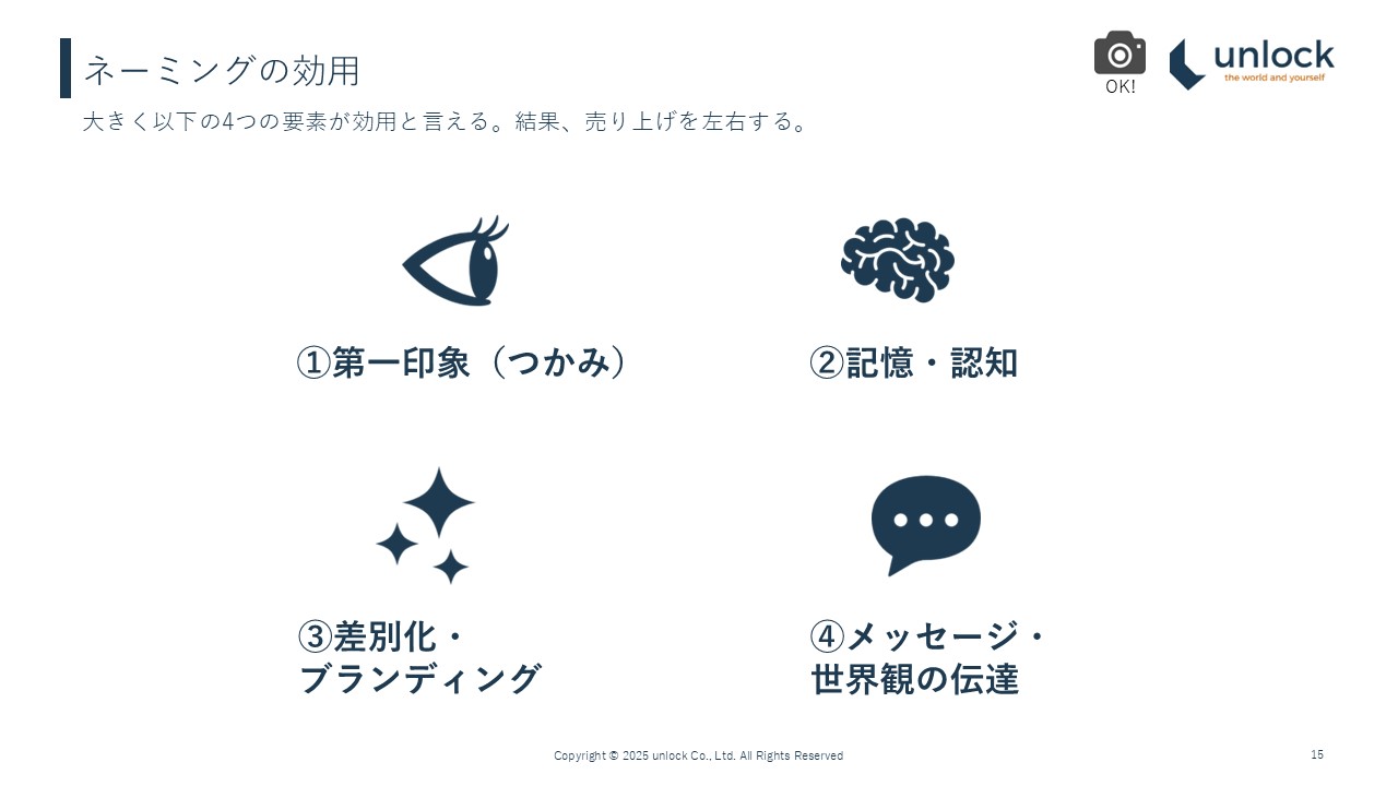②は記憶・認知、③が差別化・ブランディング、④がメッセージ・世界観の伝達です。この4つによって結果的に売上を左右する力をネーミングは持っている、と理解できると考えています。