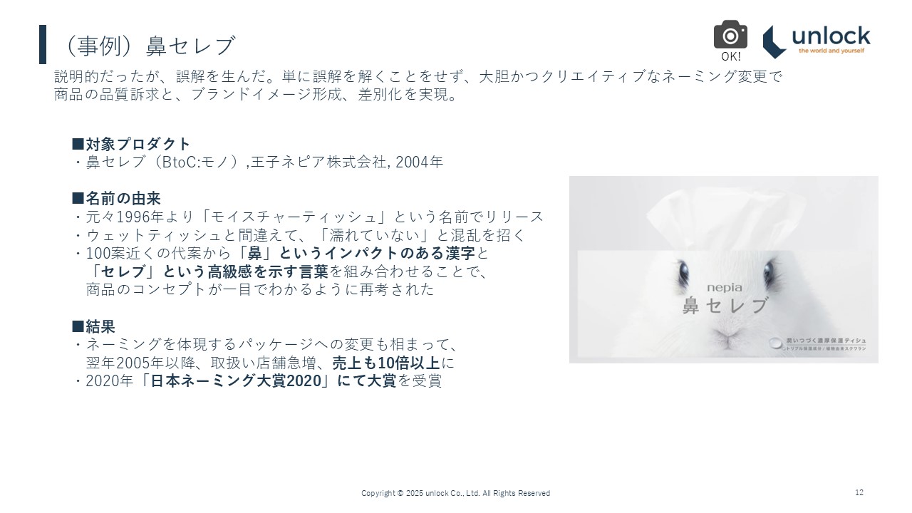 続いて有名な事例、大ヒットした「鼻セレブ」です。元々は「モイスチャーティッシュ」という名前だったそうです。