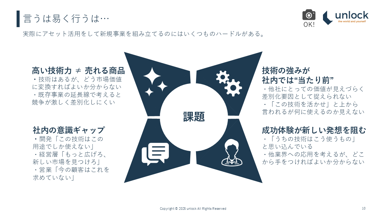 そして4つ目、社内の意識ギャップです。開発チームや技術部門は「この技術はこの用途でしか使えないから」とか、経営層は「もっと広げる新しい市場を見つけろ」とか、営業は「今の顧客はこれを求めてない」とか、様々な意見があってなかなか前に進めづらい。そんな状況があるかと思います。