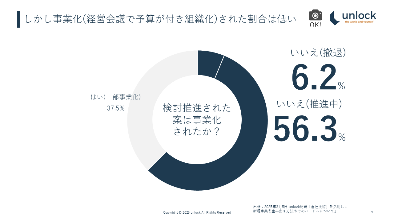 我々unlockは、unlock総研という形で様々な企業の新規事業の成功失敗、様々な企業が抱える課題等を調査しているのですが、先日、製造業の皆様にアンケートを取りました。「自社技術を活用した新規事業を検討したいでしょうか?」という問いに対し、8割は「検討したい」という回答でした。