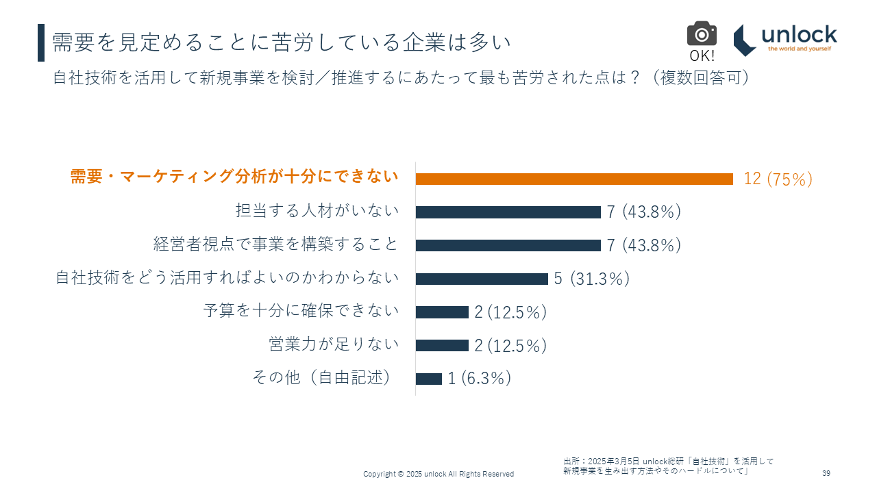 お客様の話を聞くのは良いし、様々な方法で課題や需要を集めるのは良くても、目の前にそういった情報が集まってからの分析が十分にできないことでお困りの企業様も多いです。こちら、unlock総研のアンケートでも見えてきます。