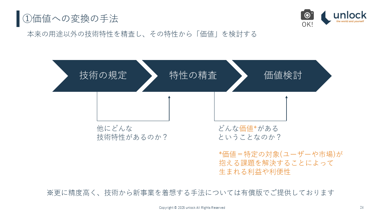 技術の再解釈の2つのうち、「①価値への変換」の部分はこれで終わりです。これが①でやっていただきたいことです。技術はこのような形で存在していても、特性を精査、分解して、それぞれの価値に置き直すということをやっていただきたいと思います。