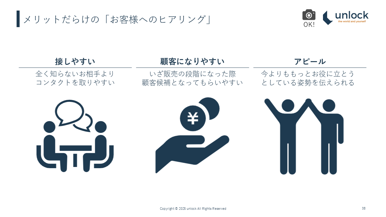 もう1つのメリットとしては「アピール」ですね。少し打算的に聞こえるかもしれませんが、今よりももっと目の前のお客様の役に立とうとしている姿勢が伝えられる。こういった効果もあって、お客様のヒアリングは非常に重要だと思っています。