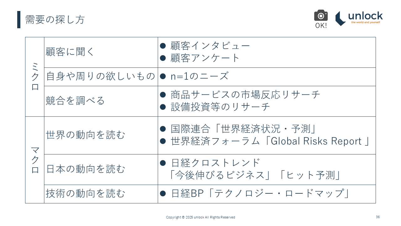なぁんだ、と感じるところも結構あるかもしれません。大きく分けてミクロとマクロがあり、ミクロはまずお客様に聞くということです。それから自分の周りにいる人に聞くっていうのも、立派な需要の探し方です。自社の同業である競合を調べるというところも、もちろんです。