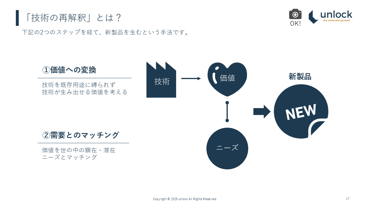 技術の再解釈というのは、①価値への変換、②需要とのマッチングという2つのステップを経て、新製品を生むという手法でした。