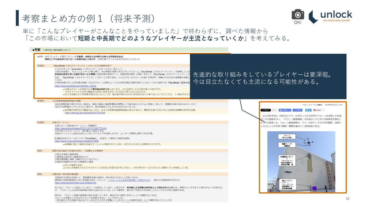 1つ目は、将来予測です。「こんなプレイヤーがこんなことやっていました」だけで終わると、「だからどうしたの?」となってしまいます。「この市場において短期と中長期ではどんなプレイヤーが主流になっていくか」ということまで考えてみるのです。特に先進的な取り組みのプレイヤーに関しては、深掘りをしていくことがポイントになります。今は目立ってなくても今後主流になるとか、そういった可能性が大いにあると考えているため、将来予測をしていく、というのが1つ目です。