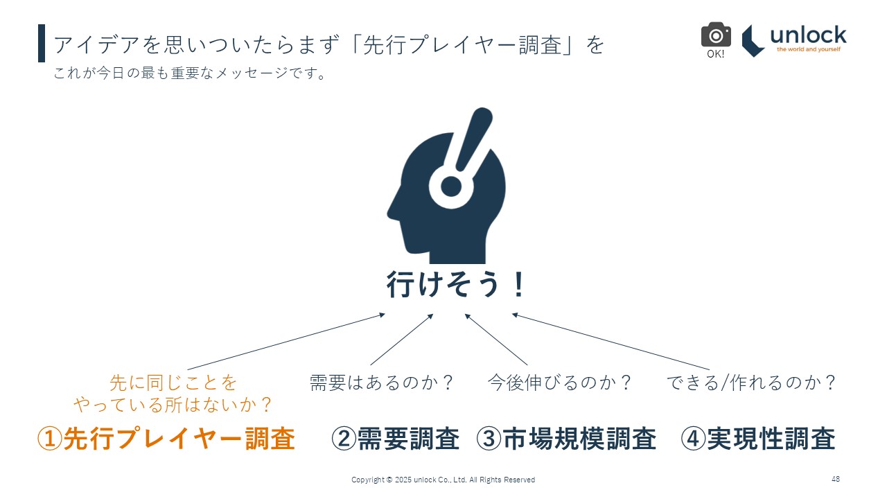 実は、一番アイデアを思いつくのは、先行プレイヤー調査です。この領域だというのを最初に思いつく必要があるとはいえ、思いついた後は先行プレイヤー調査をしていると、一番アイデアが思いつきます。既存プレイヤーを見ることで、「このお客様だったらこういうことができるなぁ」とかですね。