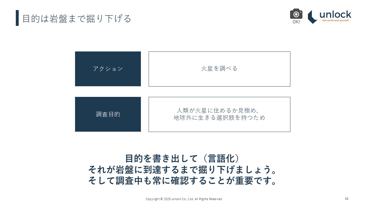 実際に聞いてみると「案外違うんだな」ということがあるので、最初に「ちょっと火星調べて」と言われたときに「わかりました」と取り組むのはもちろん重要なフットワークですが、目的を書き出して、岩盤まで自分なりに掘り下げて、それを確認することで、一番手戻りが少なく、結論もシャープな調査をすることができます。