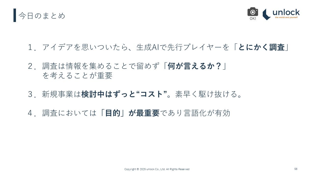 アイデアを思いついたら、今の時代は生成AI、先行プレイヤーをとにかく調査してください、というのが一番大きなメッセージです。
