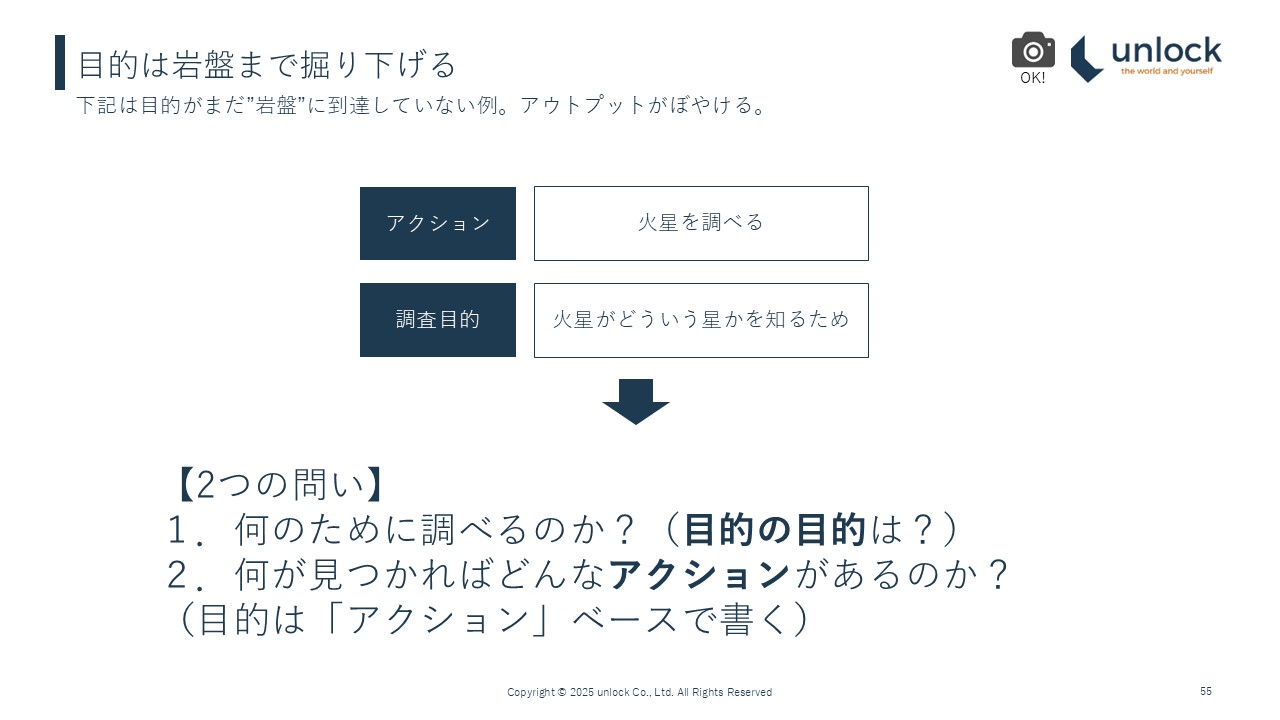 目的は岩盤まで掘り下げる。これは、先程の火星を調べるというアクション。どういう目的、火星がどういう星かを調べるためという目的も悪くはありませんが、まだ岩盤に到達してないと言えると思います。こうなるとアウトプットがぼやけます。これに対して、目的をどうやってシャープにするのか、岩盤まで掘り下げるのかというのは、この2つの問いをしていただければ大体シャープになります。