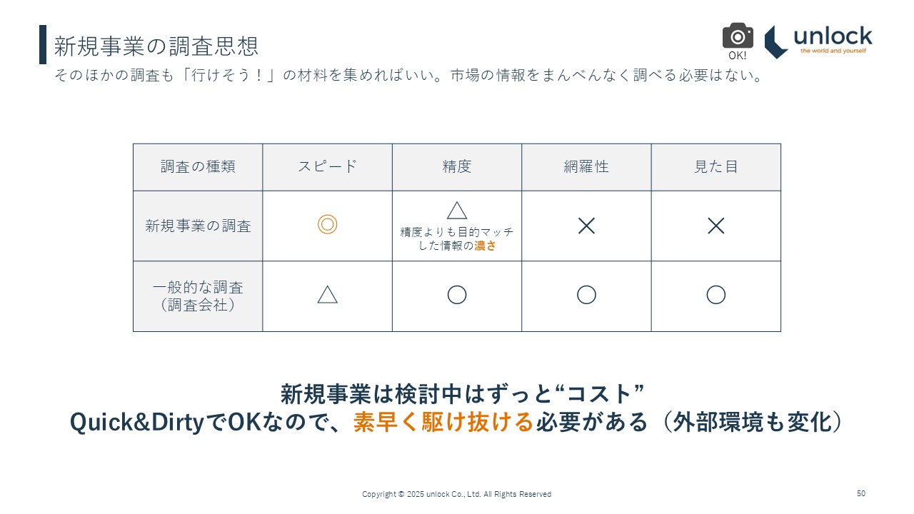 例えば、見た目。これは我々の立場からは言いにくいところもあるのですが、私が会社員の時に新規事業をやっている時、見た目はあまり関係なく、あまりうるさくは言われませんでした。網羅性もそこまでは言われませんでした。大事な情報を取り落とすことはよくないとはいえ、網羅的に調べるよりもポイントを突いていることが非常に重要でした。