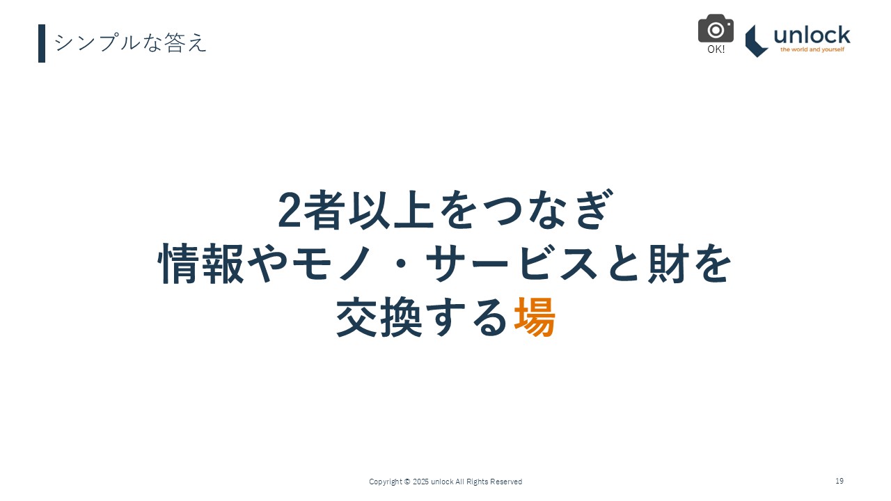 画面は依然としてシンプルな答えですが、2者以上をつないで、情報やモノ・サービスと財、その価値を交換する場です。