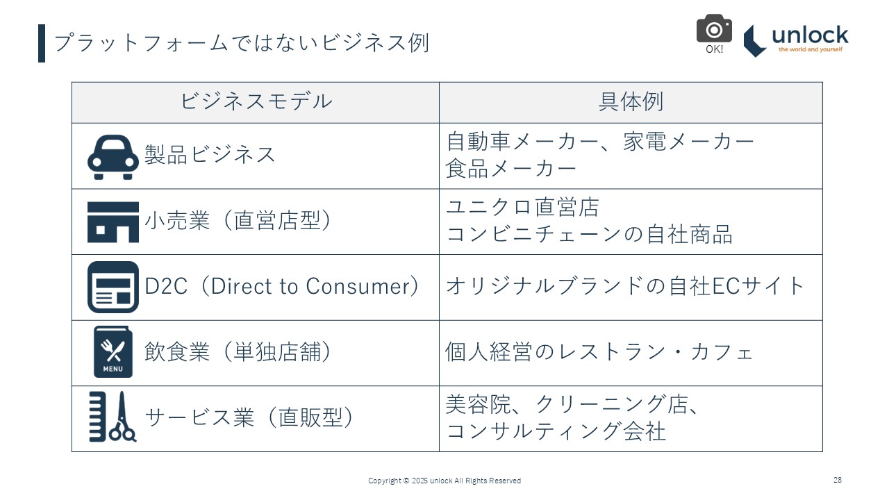 小売店もそうですね。ユニクロは自社で製品を作りますが、いわゆる小売りのように、何か商品を仕入れて店で売るのも、同じくプラットフォームビジネスでは無いと言えるビジネスです。それからECなどのダイレクトコンシューマービジネスも同じですね。飲食店、サービス業、美容院などもプラットフォームではないと言えると思います。少しクリアになりましたでしょうか?
