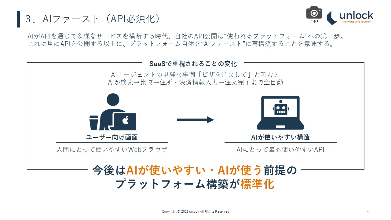 APIの説明をちゃんとする時間がないので、Webサイトの1つの形だと捉えてください。このWebサイトの1つの形であるAPIを、どのサービスも公開することがほぼ必須になってきます。なぜかというと、AIにとってはWebよりもAPIの方が読みやすいからだそうです。なので、APIが公開されていない=AIには使いづらいサイト、ということで優先順位が下がってくるのです。なので、これからはAI様が使いやすいプラットフォームが標準化してくるし、そうならなきゃいけないという時代が本当に訪れます。